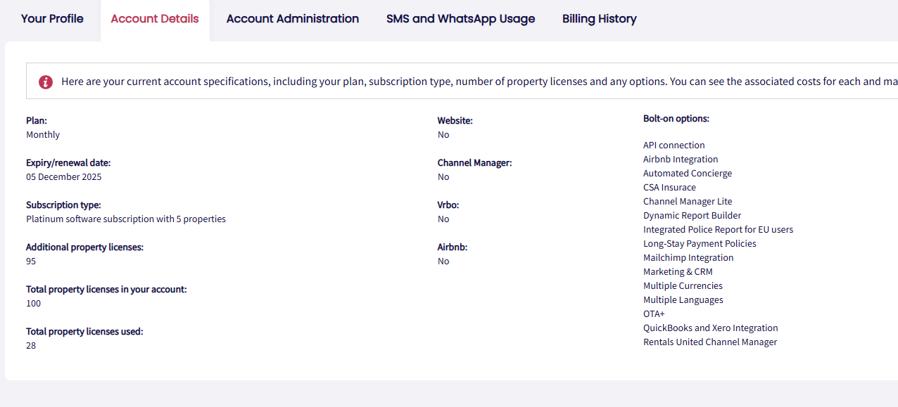 The Account Details tab shows a comprehensive view of your current account configuration. This section displays essential information such as your subscription plan, the period (monthly or annual), and the total number of property licenses available in your account. It also lists any additional property licenses you may have purchased so you can keep track of your license allocations efficiently.