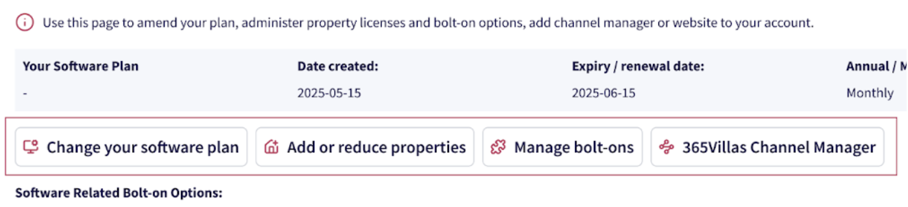 The Account Administration tab is a central hub for managing your subscription, property licenses, integrations, and bolt-ons. From this section, you can easily adjust your software plan, update property counts, enable or disable bolt-on features, and configure tools like the Channel Manager or website integrations - all in one place.