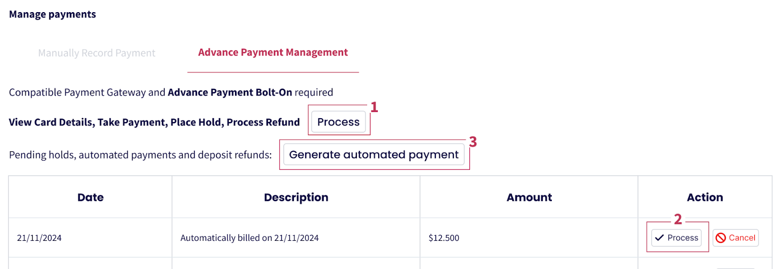 Generate Automated Payment option: Appears after the first payment is completed; used to re-enable automated payments for the booking.