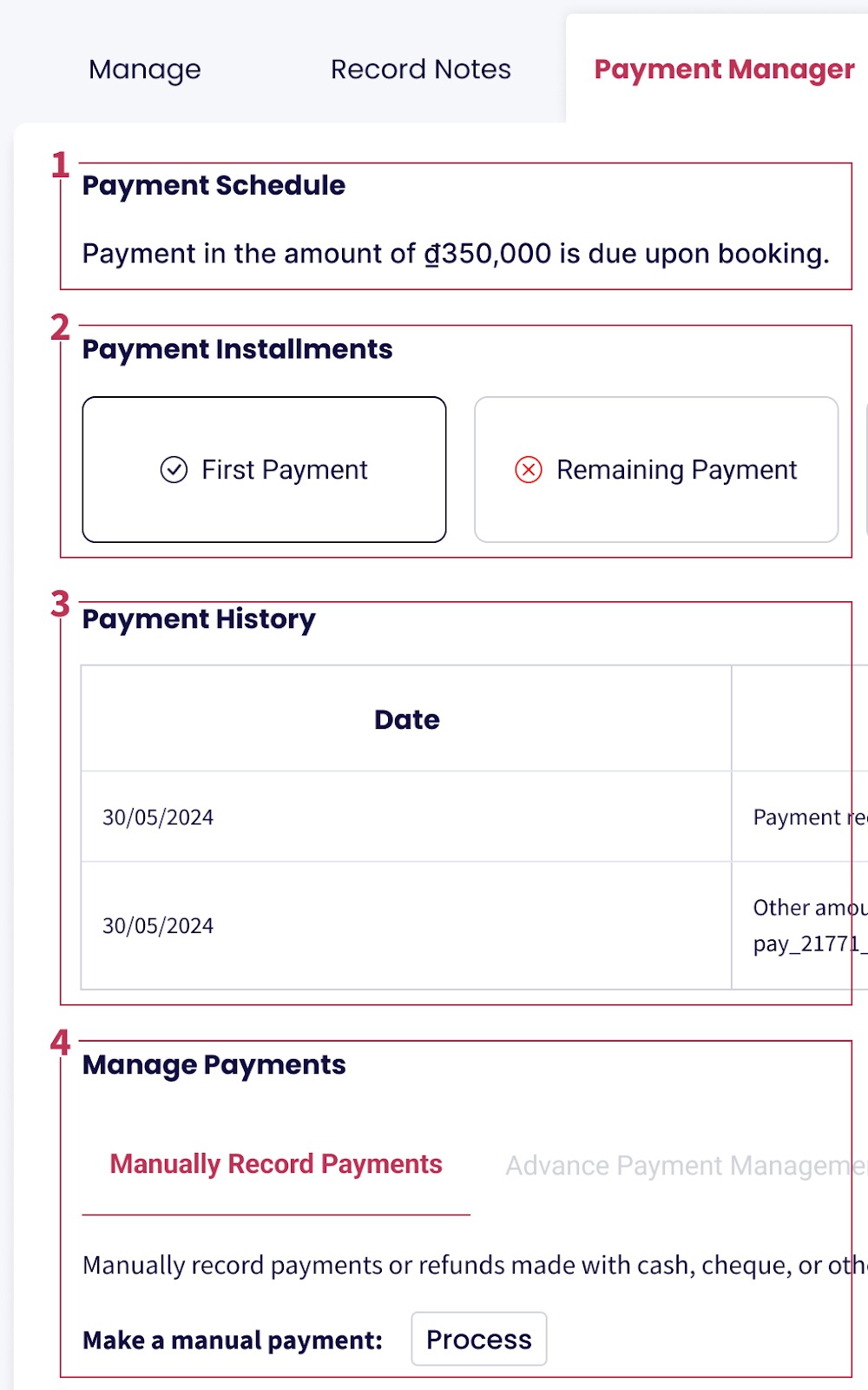 Displayed across key screens, these icons provide a clear, instant snapshot of each booking’s payment status for easy oversight. When clicked, it opens the Booking Payment Manager page.