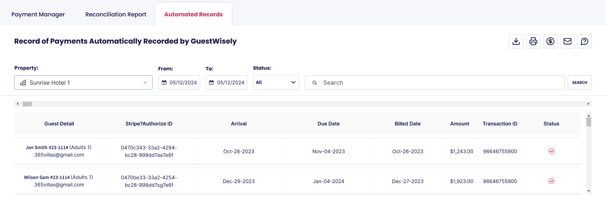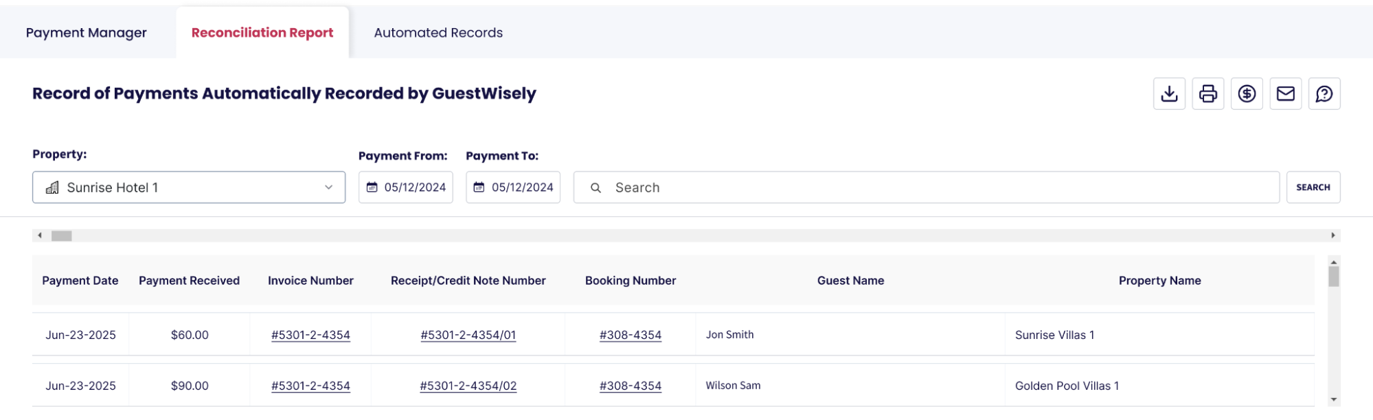 Reconciliation Report: Simplifies monthly reconciliation by effortlessly matching GuestWisely records with your bank transactions.