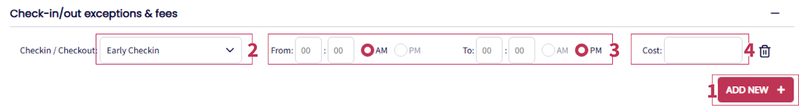 Exceptions and Fees allow you to set charge fees for Check-In and Check-Out exceptions in addition, if your guest can not meet your Check-In or Check-Out times when they create a booking on the Rentals United page.