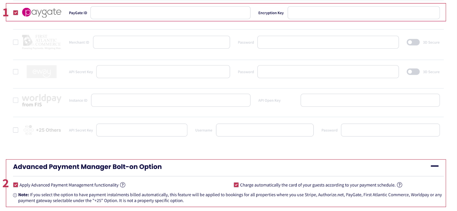 Note: If you select the option to have payment installments billed automatically, this feature will be applied to bookings for all properties where you use Stripe, Authorize.net, PayGate, First Atlantic Commerce, Worldpay, or any payment gateway selectable under the "+25" Option. It is not a property-specific option.
