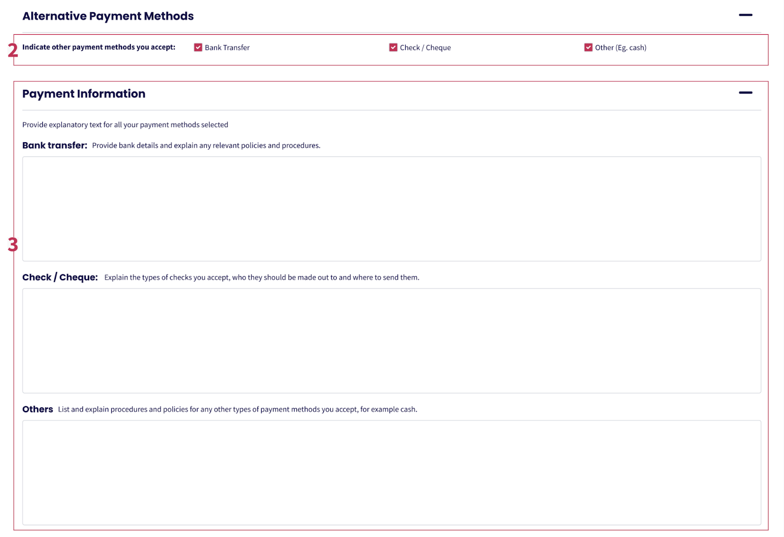 2. Indicate the other payments you accept: Bank Transfer, Check/Cheque, Other (cash).