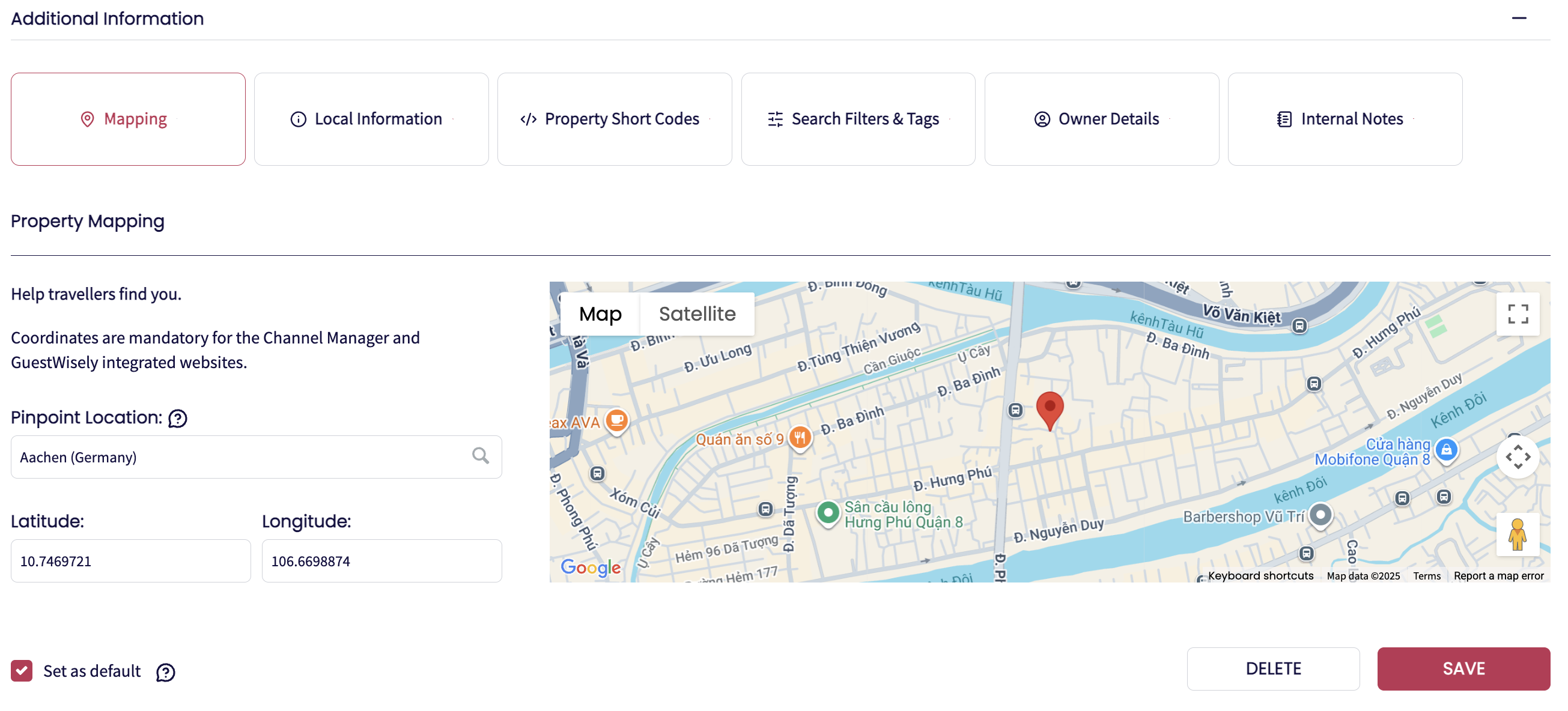 Mapping will show you the location of the property, it integrates with your GuestWisely booking engine and channels to help travelers find your property easily. Search for your location in the “Pinpoint Location” field to pin it on the map: