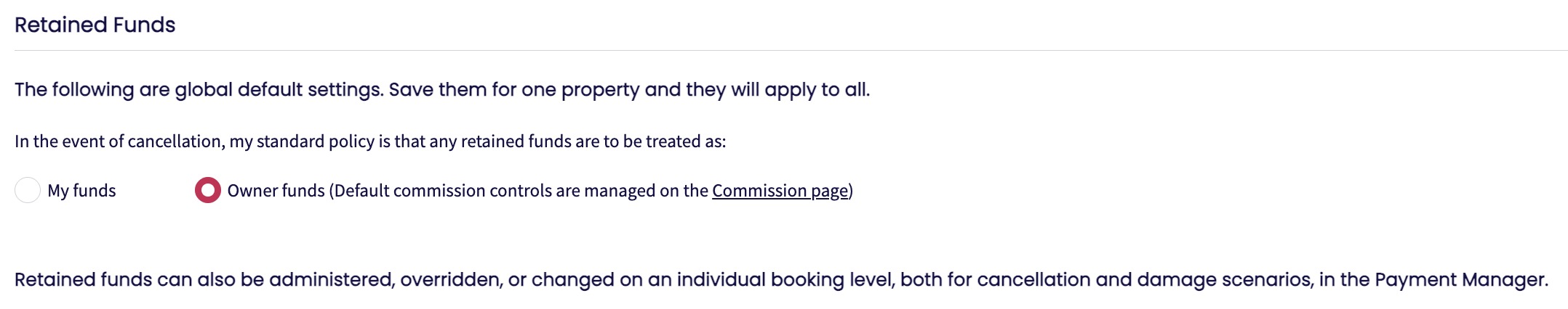 Funds retained due to cancellations can be allocated to the Owner Statement for accounting purposes. This can be set as a default policy and also managed for individual bookings.