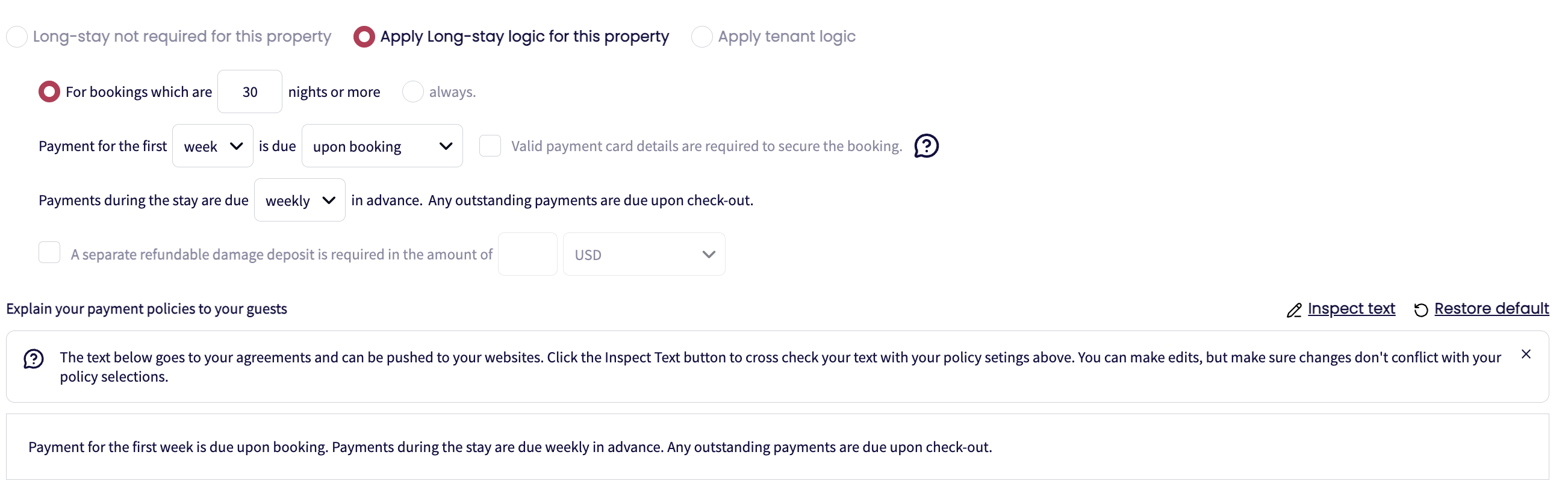 If you are planning to offer extended stays alongside short-term bookings or cater exclusively to long-term tenants, GuestWisely provides dedicated settings within the Payment Policies section. Here, you have three options to choose from: