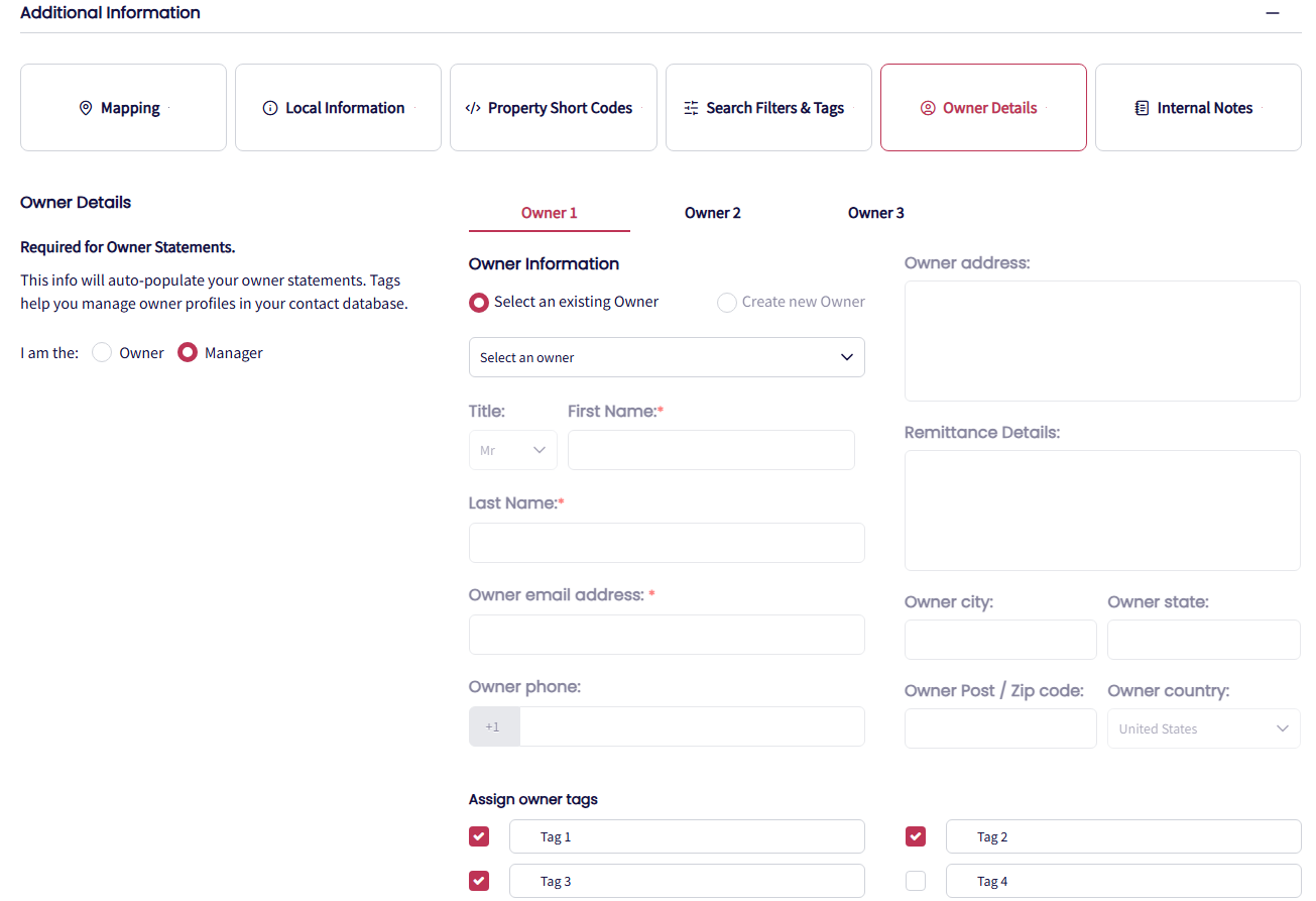 The Owner Details section allows you to assign owners to your properties and manage ownership information efficiently. Key benefits include: