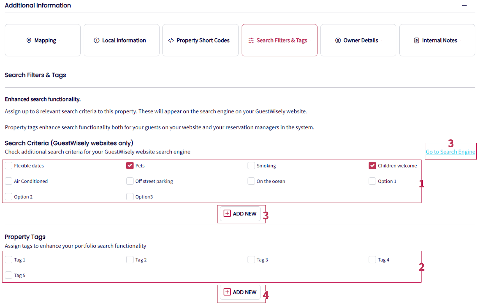 Tags: Property tags enhance search functionality both for your guests on your website and your reservation managers in the system.