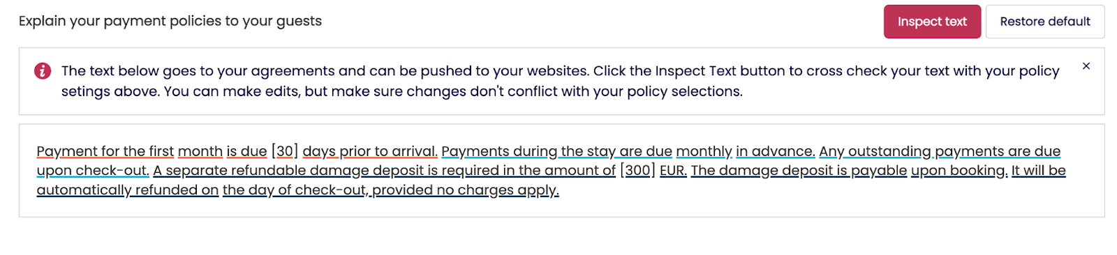 Explanatory Text: Like for Short-Stay, the system provides default text for your Rental Agreement and website explaining your policies. You can review and edit this text for better clarity.