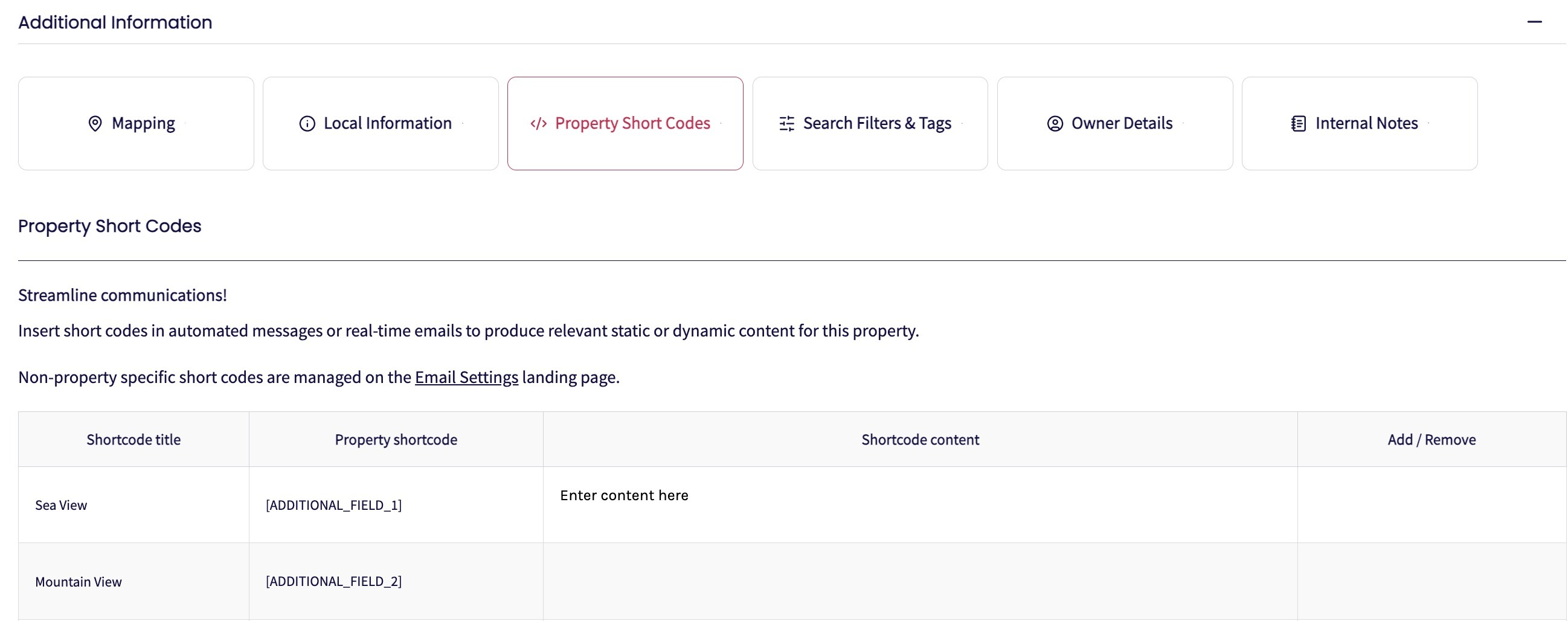 Insert short codes in automated messages or real-time emails to produce relevant static or dynamic content for this property