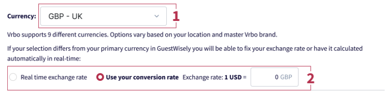 This currency setting applies specifically to your Vrbo account, regardless of the currency set in GuestWisely, as only certain currencies are supported by the channel.