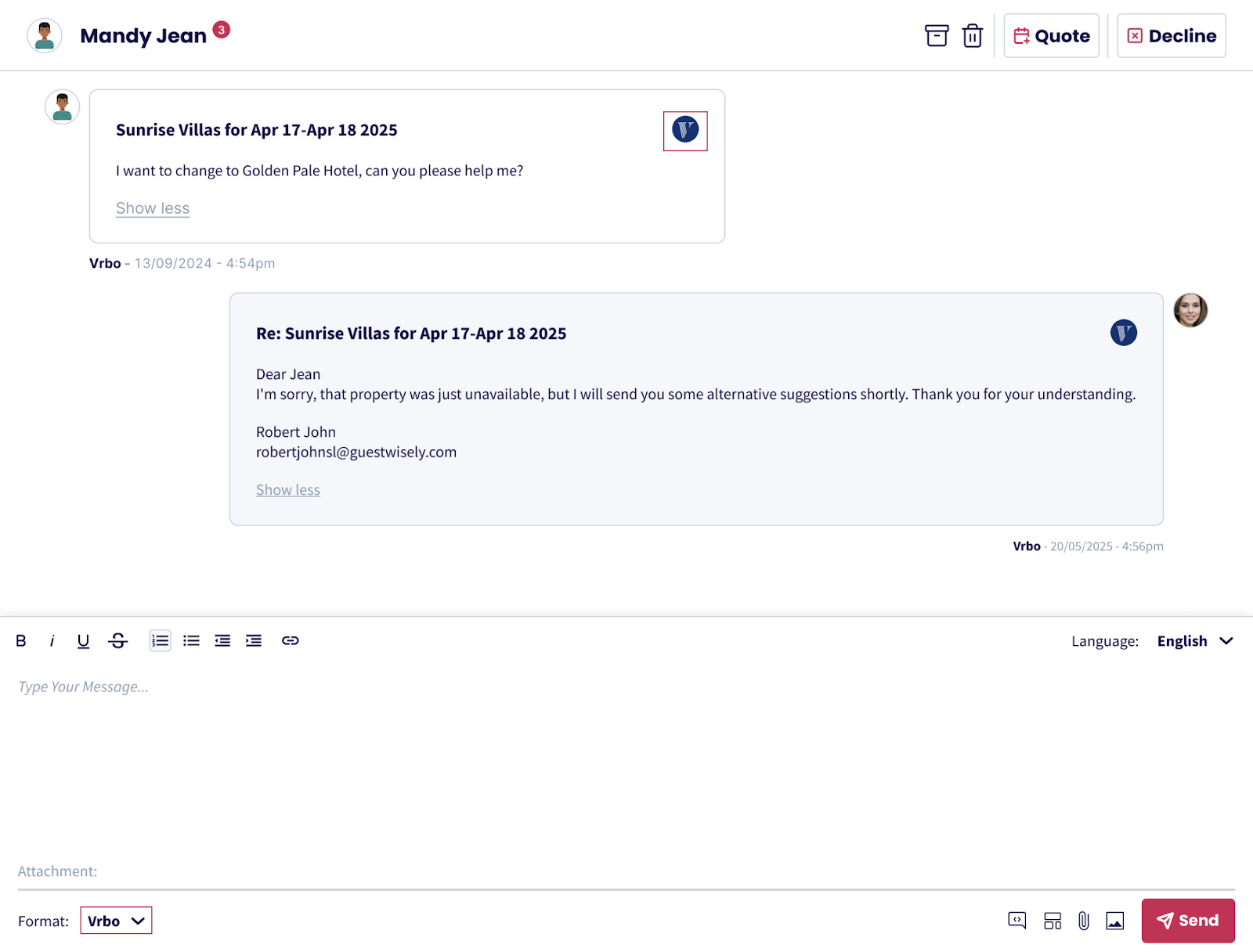 Messages initiated from GuestWisely will be visible within your Vrbo messages. Similarly, if you choose to reply through the Vrbo platform, the response will be received back into your GuestWisely interface.