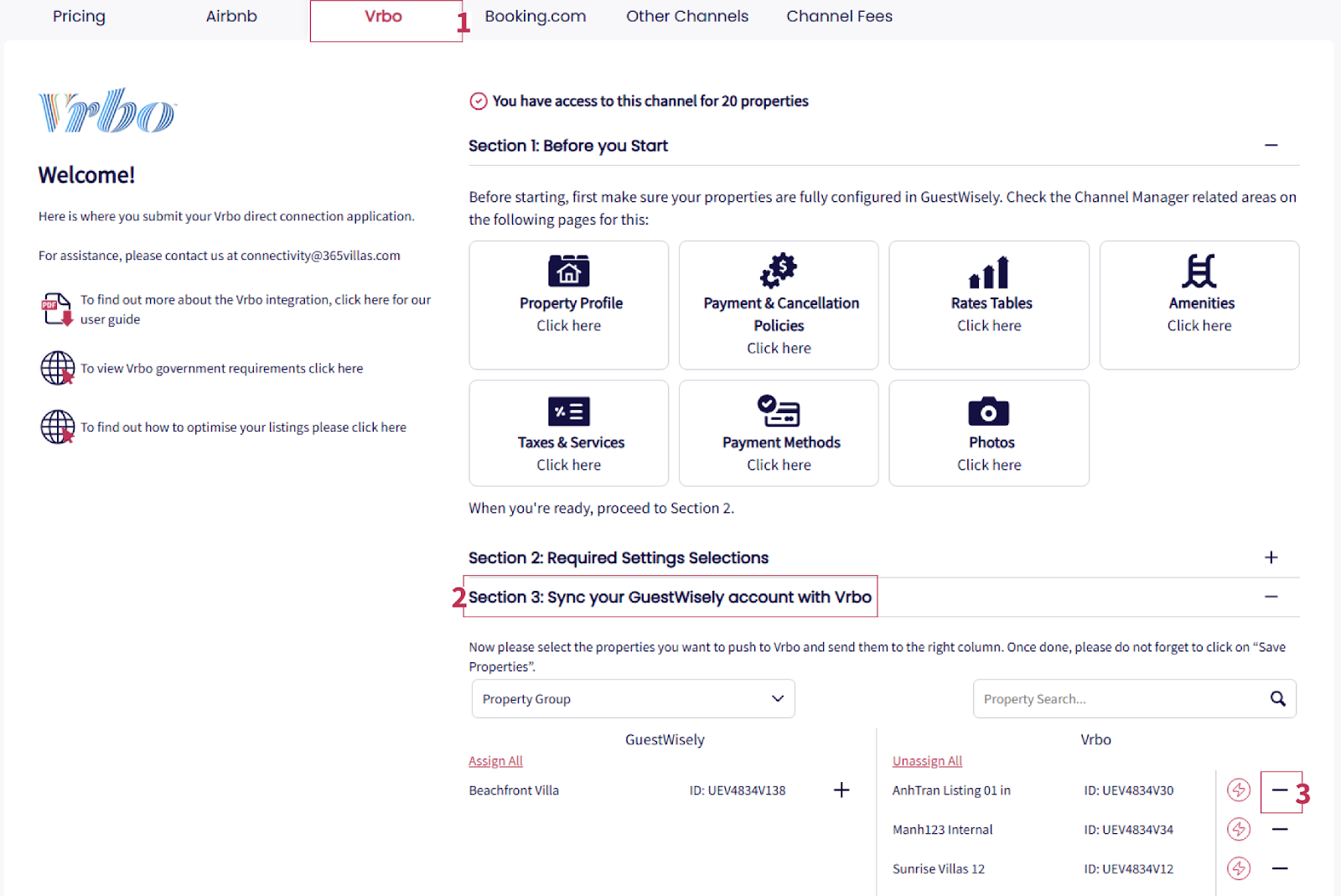 If your listings already exist on Vrbo, make sure to select all properties in GuestWisely, as the integration is done at the account level and includes all active listings.