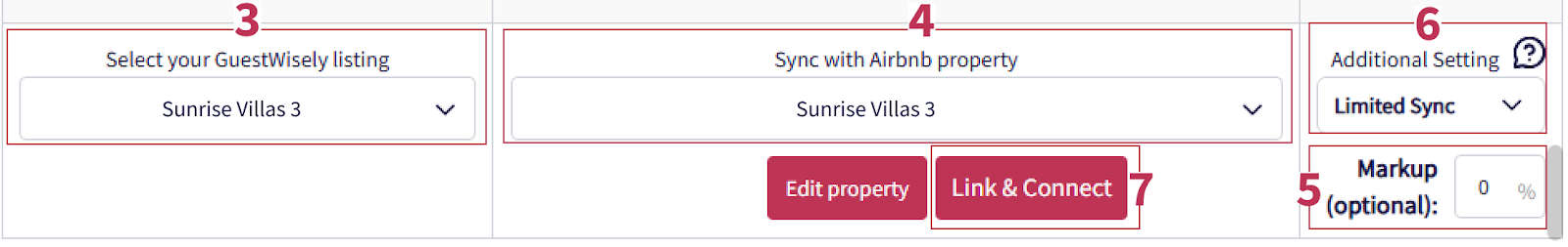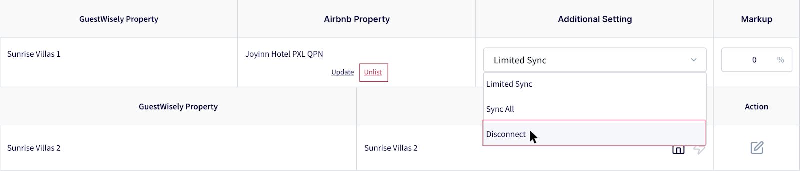Sync All: Syncs all property details from GuestWiselyto Airbnb. Recommended for comprehensive management.
