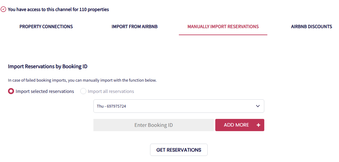 Go to Channel Manager > Airbnb > Manually Import Reservations, to import reservations by Booking ID: