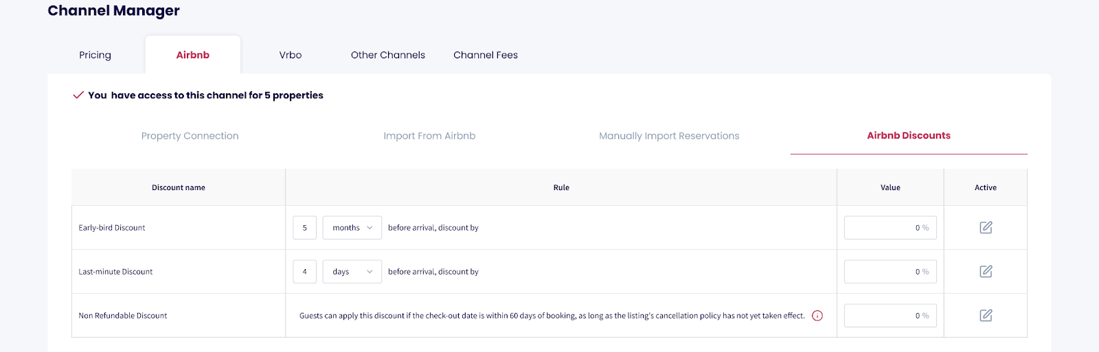 Manage custom discounts for Airbnb bookings by going to the Channel Manager > Airbnb > Airbnb Discounts tab within GuestWisely.
