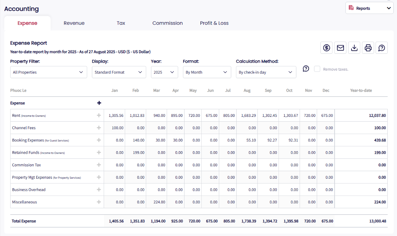 The Expense Report provides a comprehensive view of all your expenses in one place, combining Booking Expenses from the Booking Editor with all Other Expenses tracked in the Expense Manager. With dynamic filters and flexible formatting, including Standard and Customized views, you can generate professional, tailored reports that fit your vacation rental management needs effortlessly.