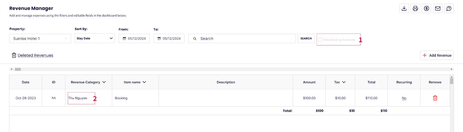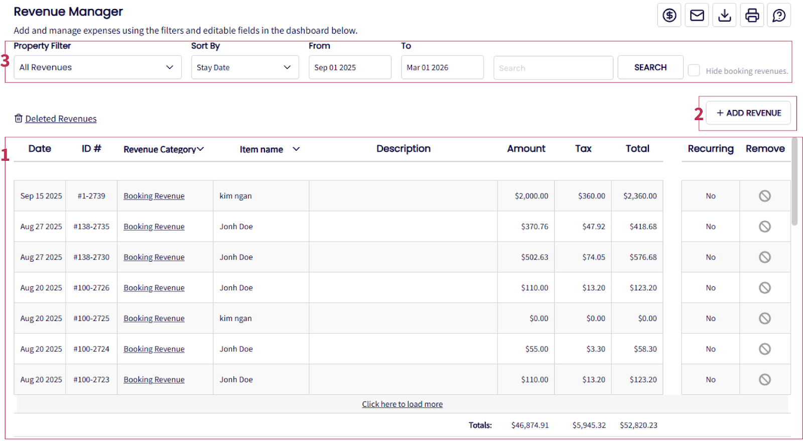 This guide will begin with how to manage Other Revenues created in the Revenue Manager, then cover Booking Revenues and Revenues from Owners.