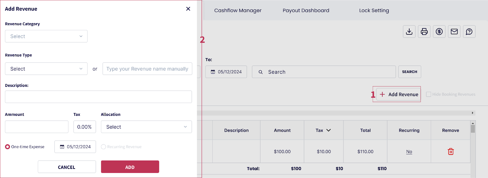 When the Add Revenue pop-up appears, fill in all revenue information.