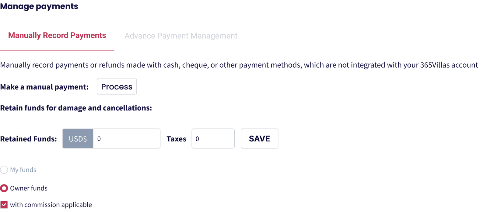 Retained Funds: Amounts collected from guests for damages or cancellations. These can be held or assigned as Owner Funds, with optional commission.
