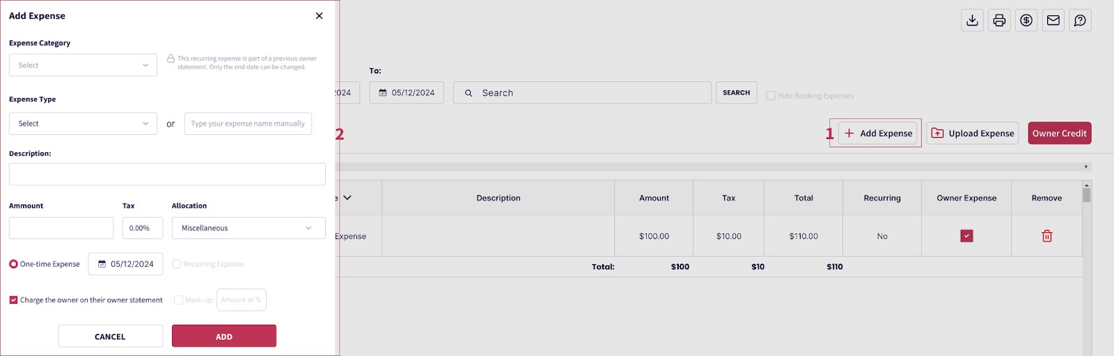 You can assign expenses to specific properties or owners, upload in bulk, and track reimbursable costs incurred on behalf of owners. These expenses are automatically reflected in reports and Owner Statements.