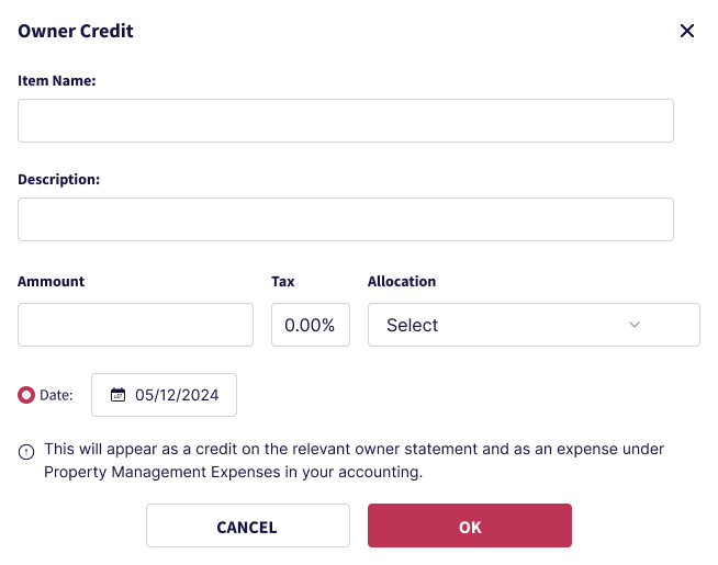 Then, enter the credit name and description, specify the amount and applicable taxes, select the credit date, and assign it to the relevant property and owner. The credit will then be reflected in their Owner Statement.