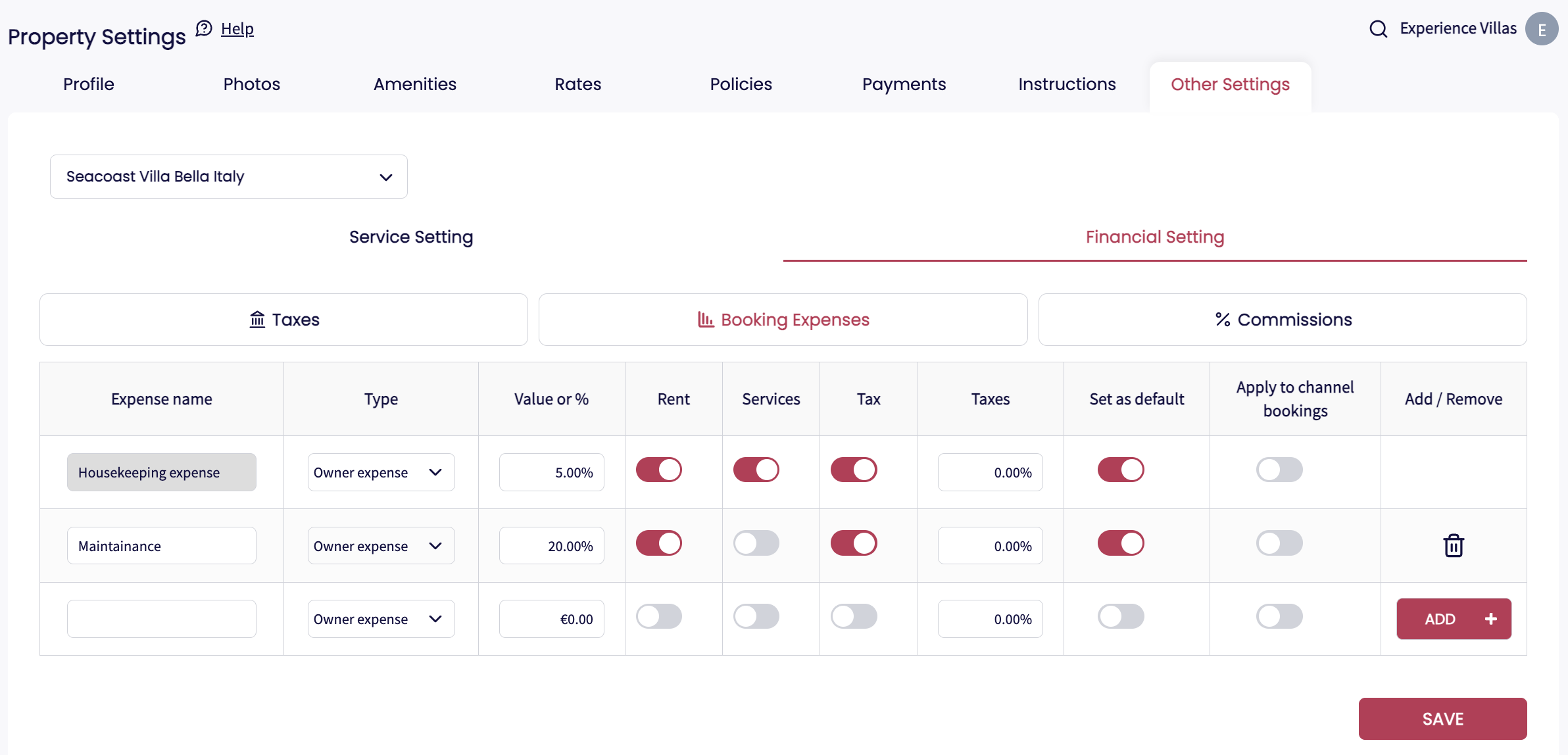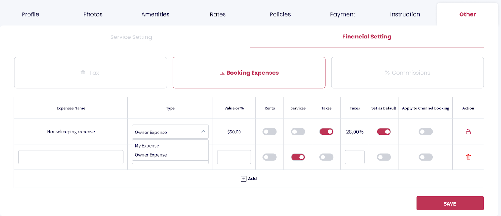 1. Booking expenses are configured in the Booking Expenses are of the Property Settings part of the system, where they are categorized into one of two types:
