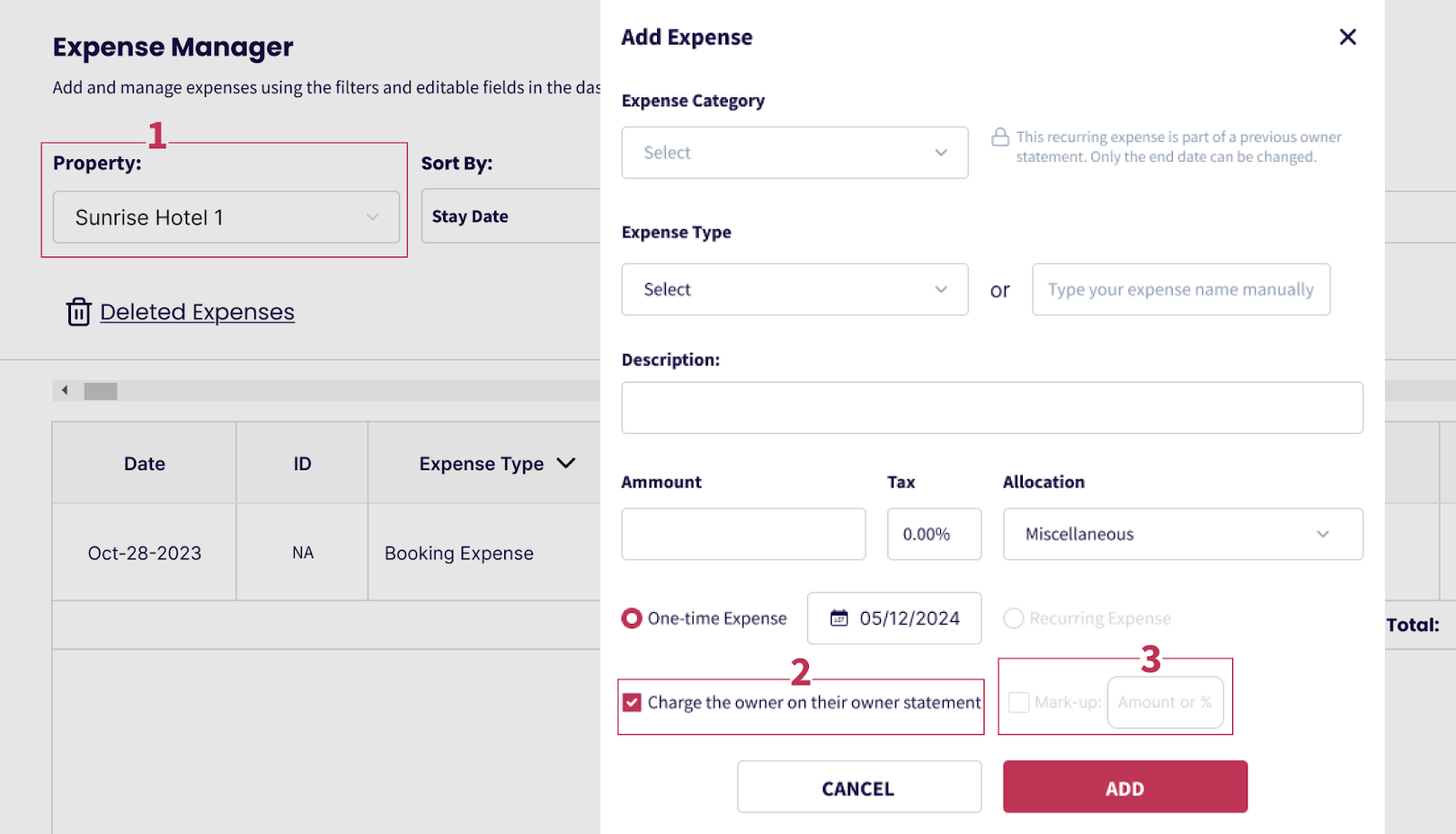 Booking Expenses automatically flow to your Expense Manager, Expense Report, Profit Loss Report, and Owner Statements etc.