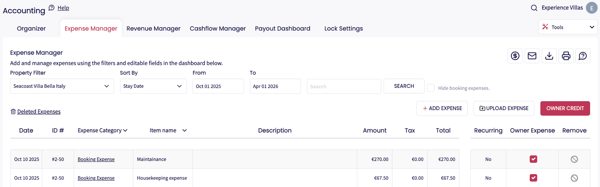 In this part of our tutorial, we’ll walk you through essential expense management features. We’ll also cover related topics, such as booking expenses, credits, and owner-related expenses.