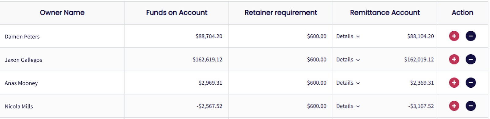 Remittance: This is the amount transferred to the owner after accounting for the balance, retainer, and any deductions, i.e., the payout amount for a given period.