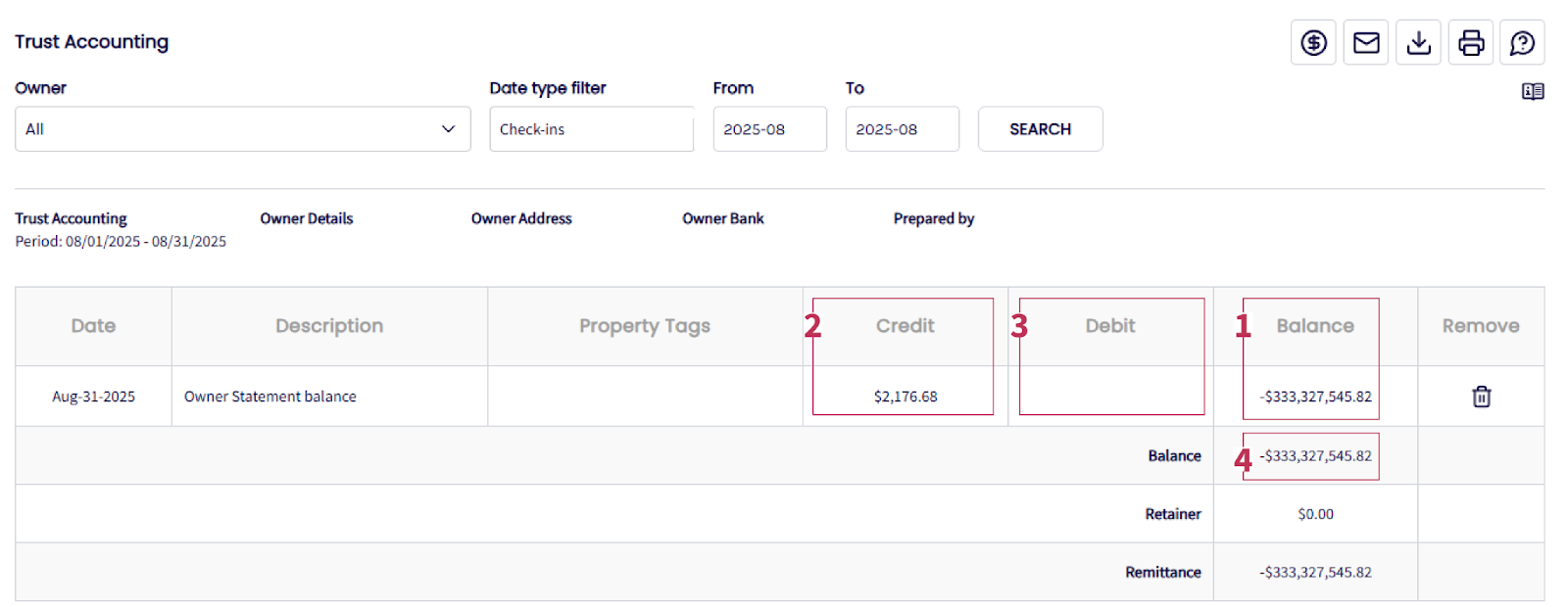 Trust Accounting Balance: This is the total amount owed to the owner based on the rental income received, minus any expenses or deductions. It reflects the owner’s overall financial standing in the system at a given time.