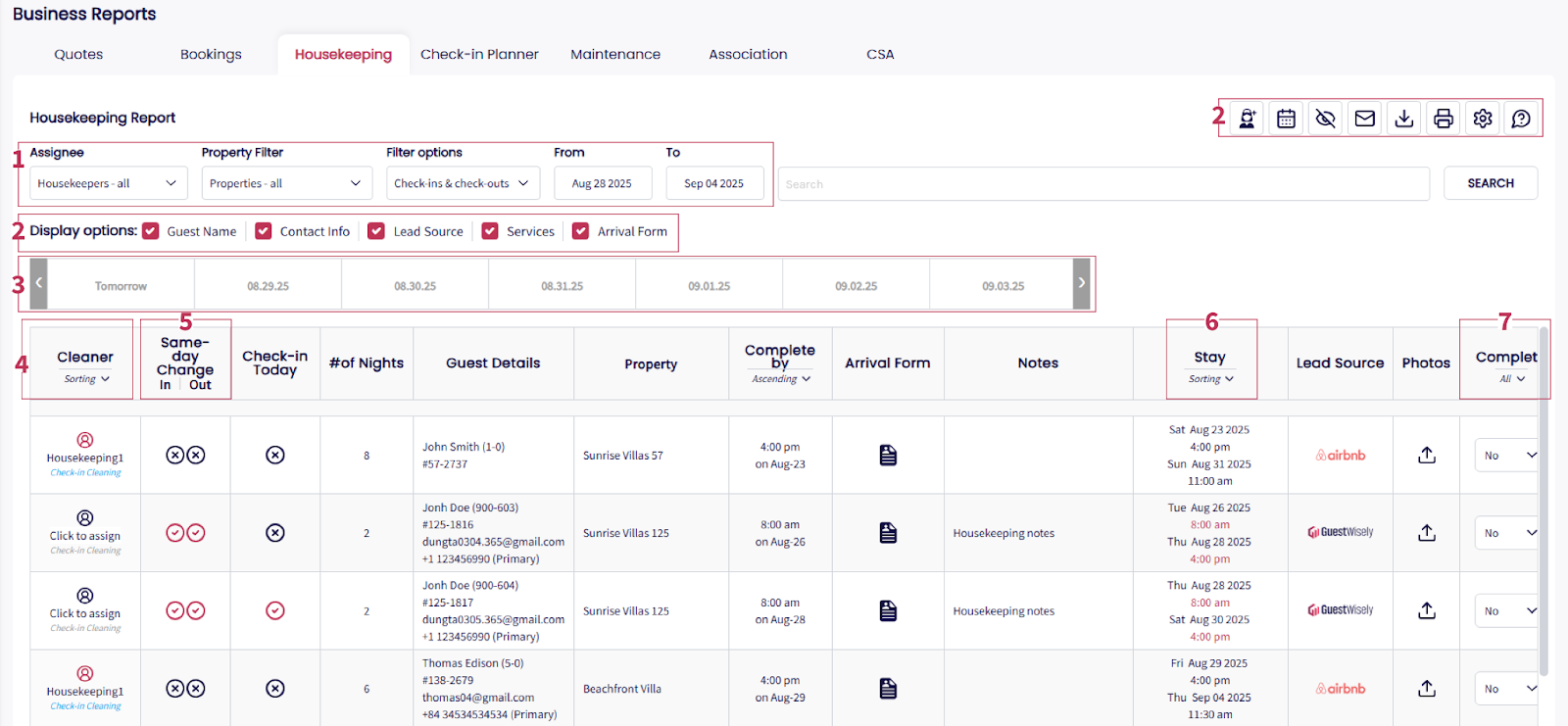 - Filter Options: Filter by housekeeper, property, and stay milestones and dates.