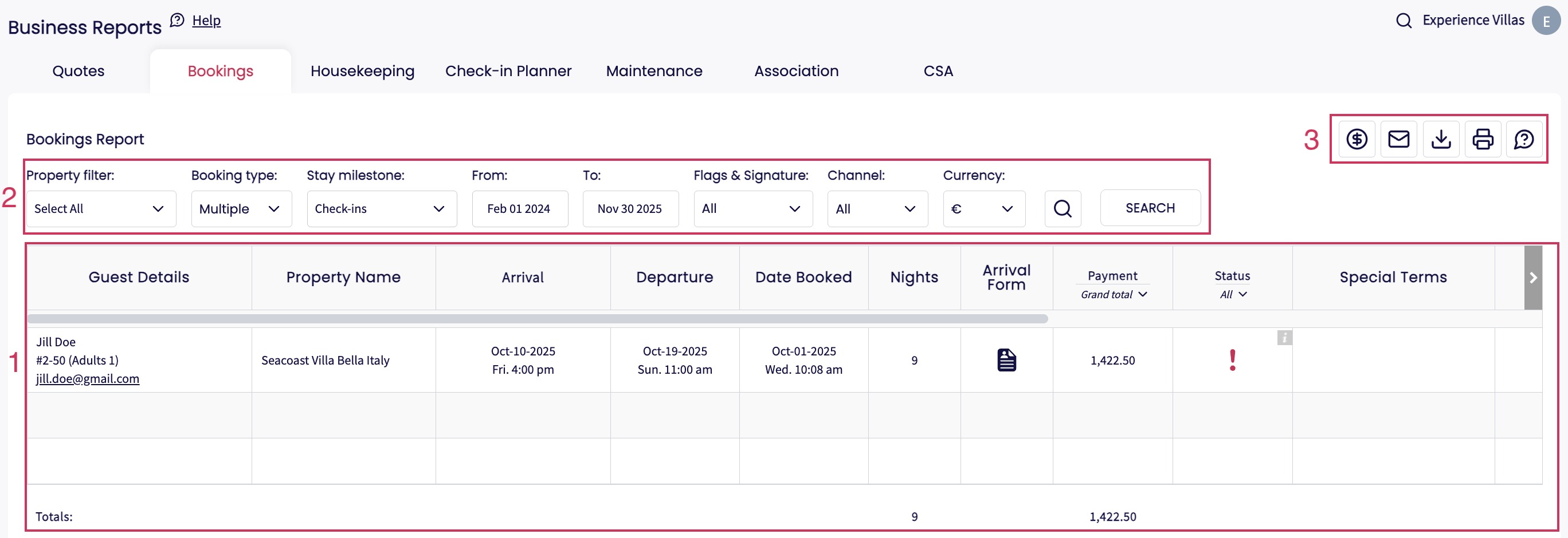 In the Guest Details column, clicking the phone number or email will enable you to directly contact the guest. Click name or booking ID to view the quote or booking.