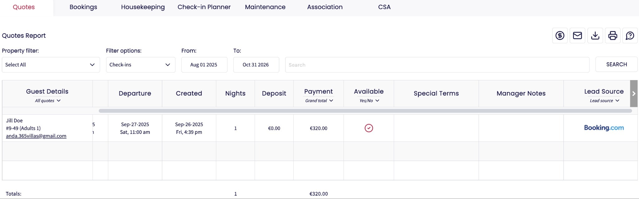 Alongside guest, booking, and payment details, the report shows the quote’s lead source and current availability. You can also add internal notes and special terms agreed with the guest. These terms will appear in an updated rental agreement.