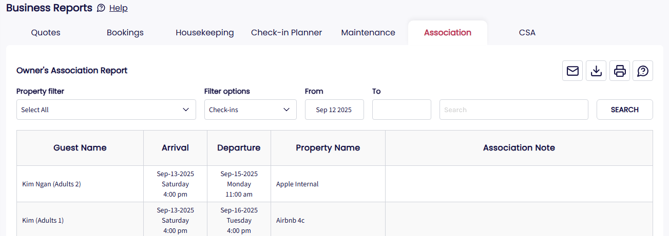 The Association Report is designed for communities where property managers are required to submit occupancy reports to a local estate manager. It provides a concise summary of guest information for a specific date range, while excluding sensitive financial or personal contact details.