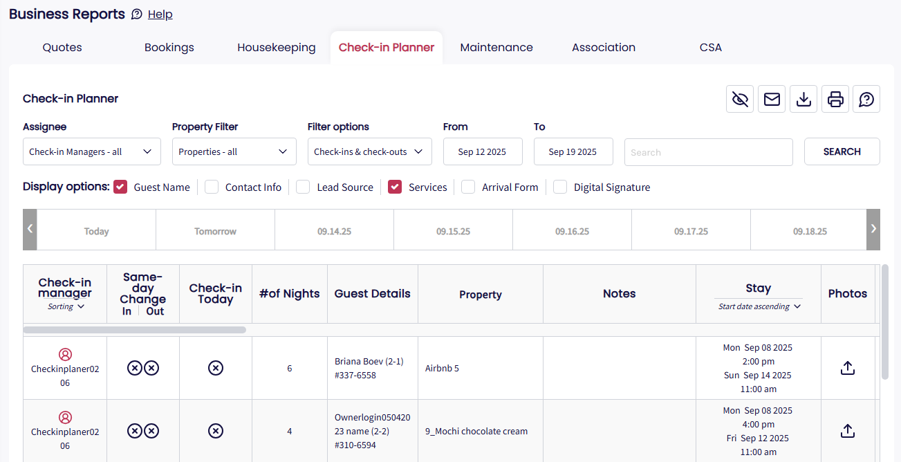 The Check-in Planner or Check-in Manager report offers a similar layout and functionality to the Housekeeping Report but is used to confirm properties are ready for guest arrivals.