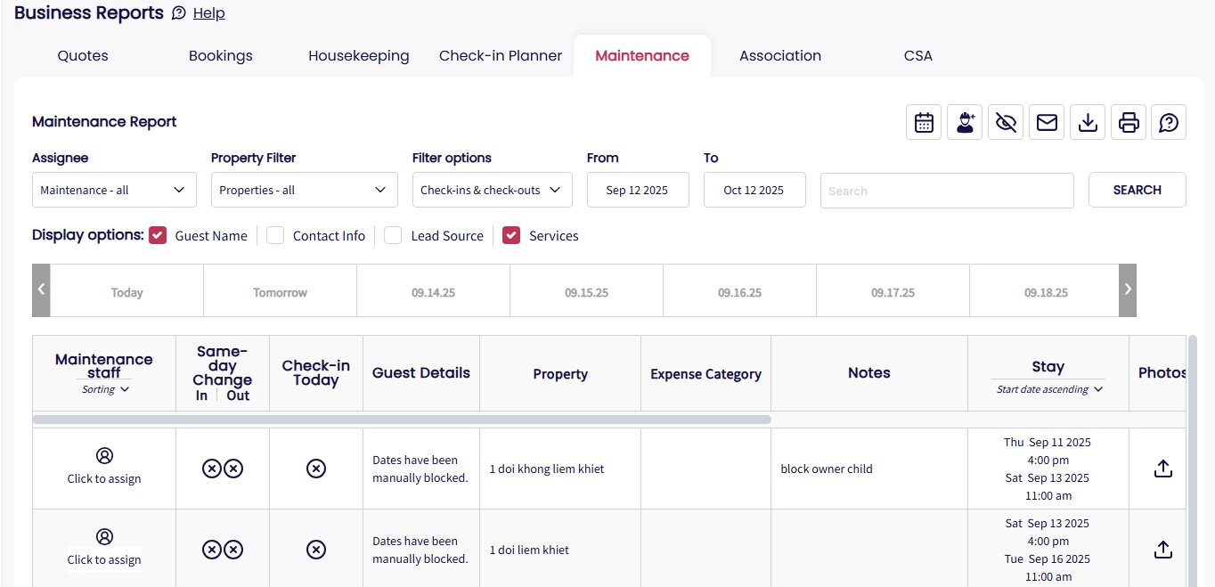 The Maintenance Planner lets you create and track tasks, distinguishing between those that can be handled during a guest stay and those that require the property to be vacant.