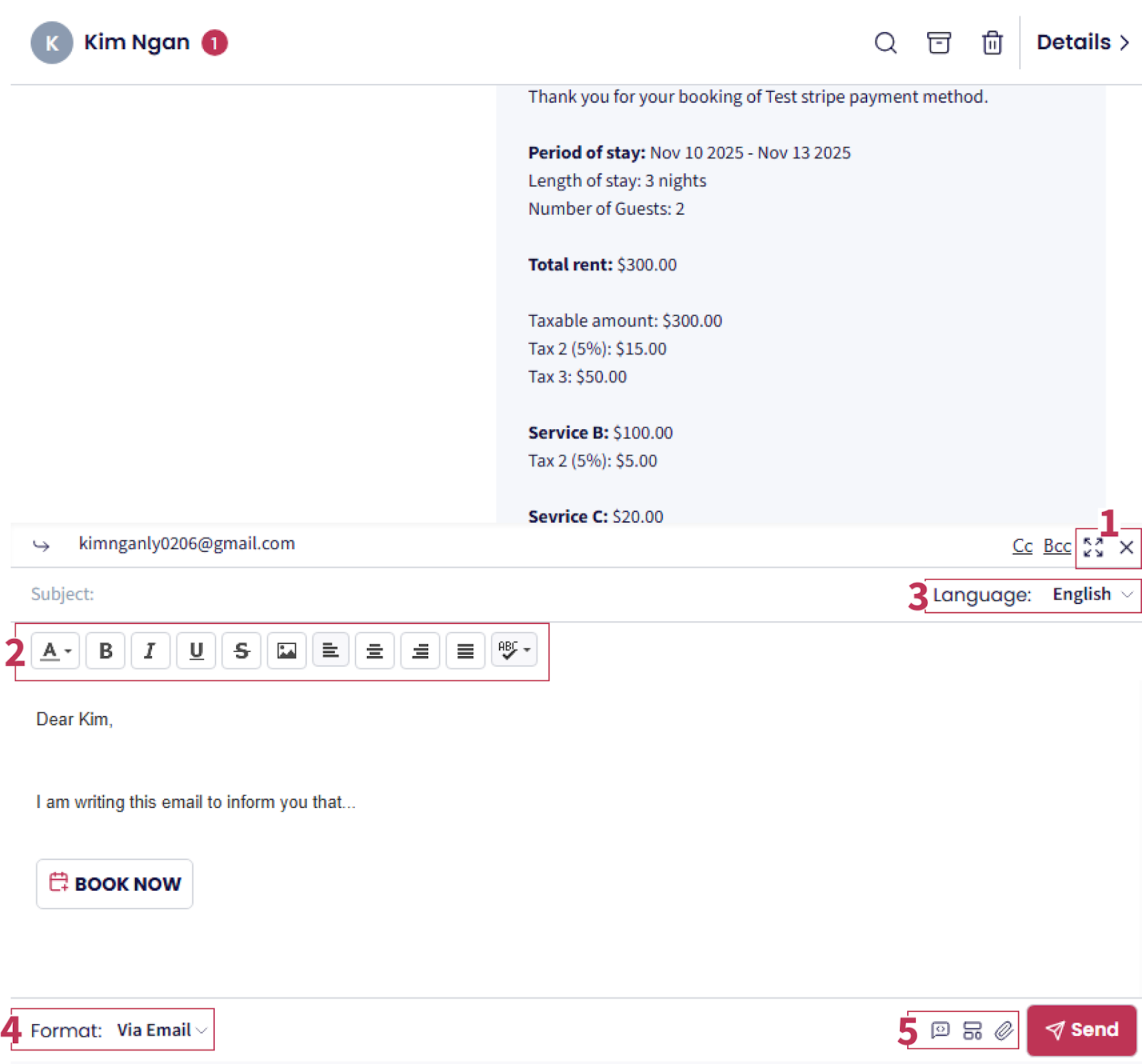 Format Widget: use this to choose between Email, WhatsApp, Text Messaging, Airbnb, Vrbo, and Booking.com Messenger communication mediums.