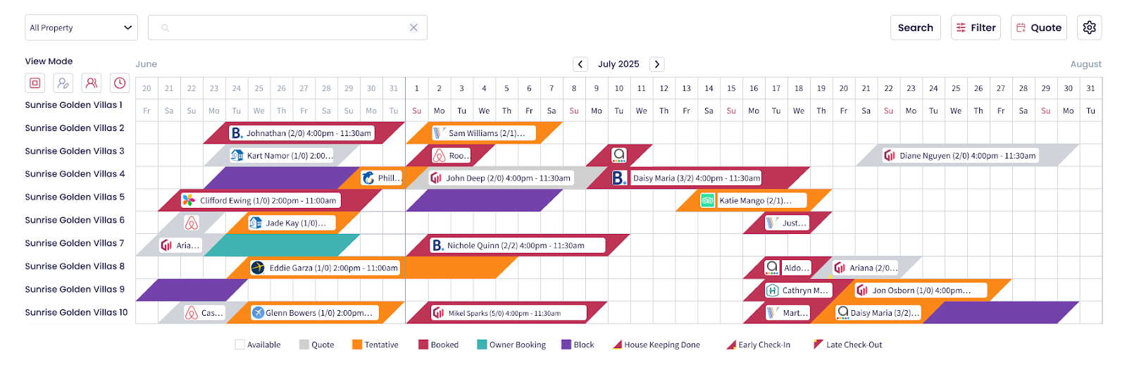 The Portfolio Calendar lets you view and manage all bookings from a single place. Properties displayed and information overlaying booked dates are flexibly configurable. You can create quotes or bookings, block dates for maintenance or owner use, or adjust rates directly from the calendar.