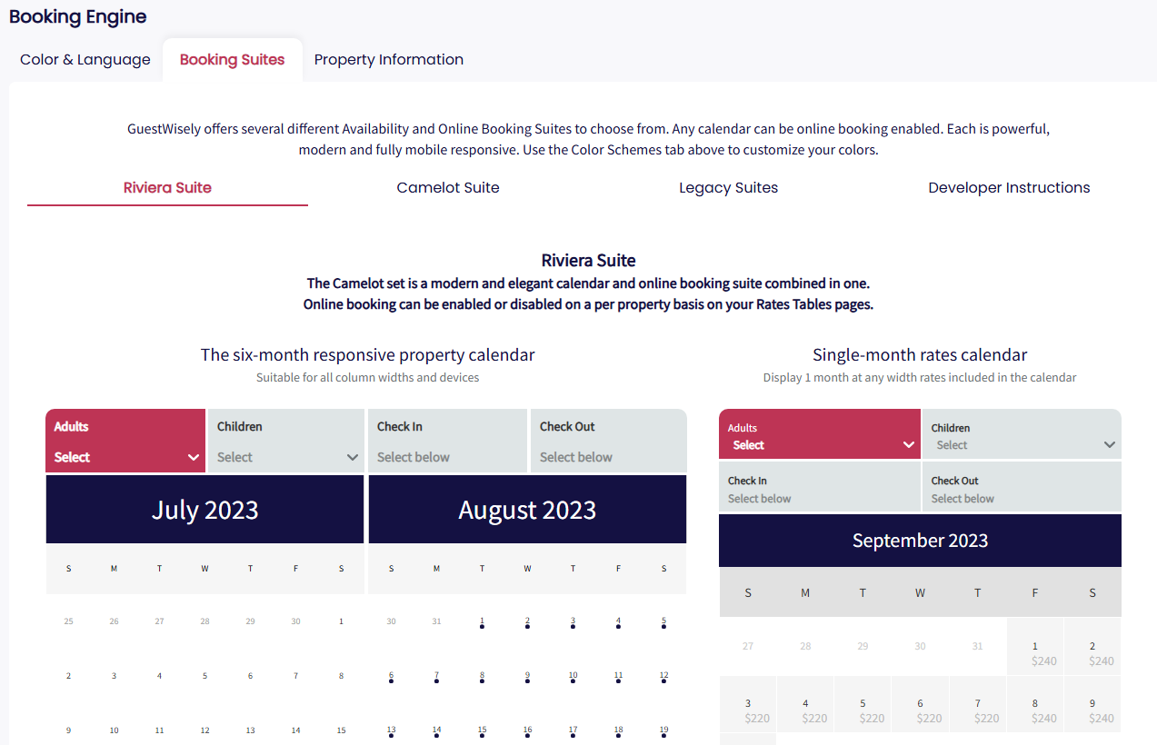 Easily preview and create embeddable calendar widgets using GuestWisely’s customizable design themes. The Riviera and Camelot Suites offer sleek, responsive layouts that combine availability and booking in a single interface - perfect for a smooth integration into your website.