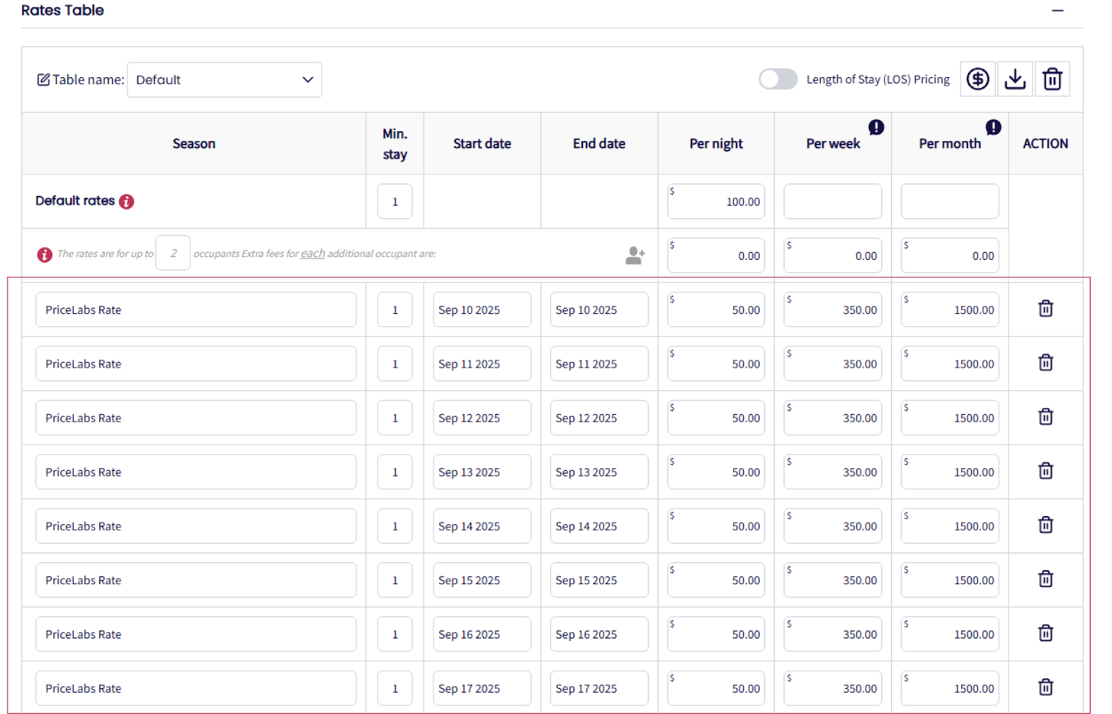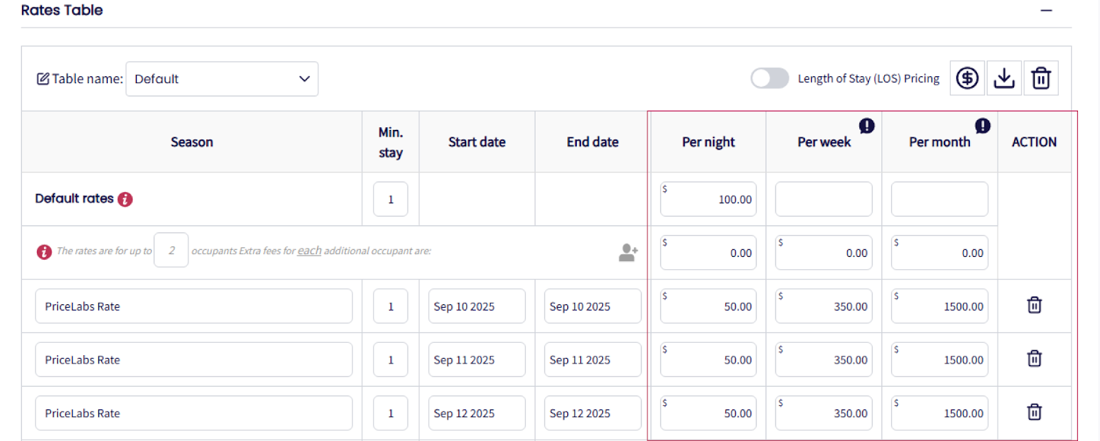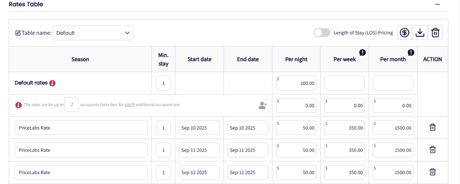 Rates Table: PriceLabs needs at least one large season with future dates to begin updating prices. Make sure this is set up in your GuestWisely account under the Rates Table.