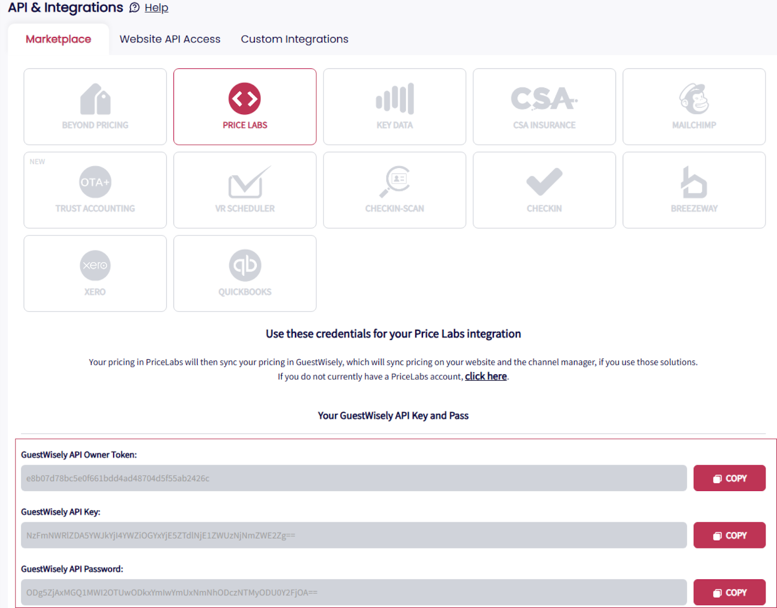 Copy your API Key and Password, and optionally, the Owner Token (needed if you want to import GuestWisely’s internal listing names (nicknames) into PriceLabs)