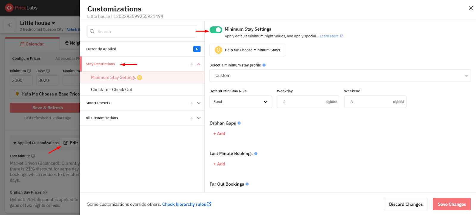 Click Edit under Customizations and set your desired minimum stay restrictions