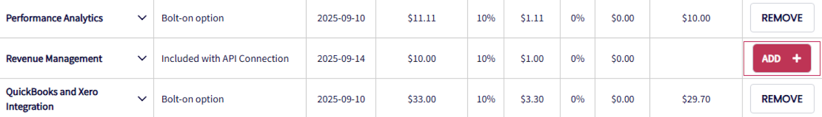 Account Administration > Manage Bolt-ons > Revenue Management, click Add, then Confirm.