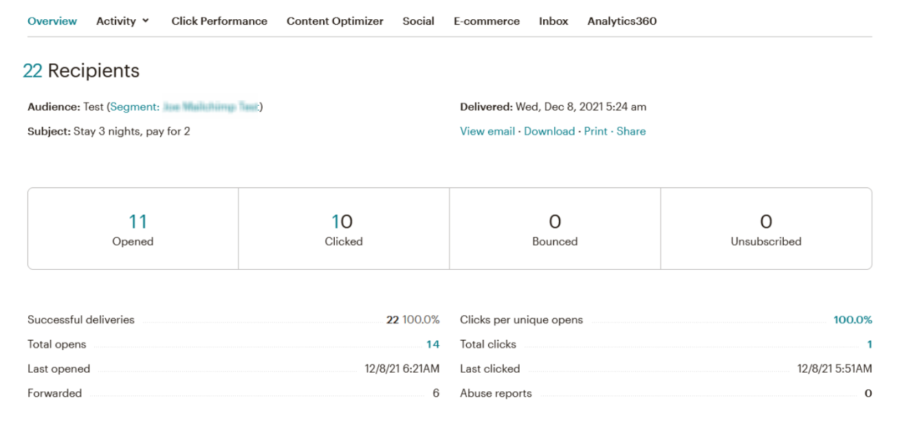 Once you've selected your audience, loaded your template, and customized your content, you can send the campaign via Mailchimp to leverage their full suite of analytics and performance metrics available on their platform.