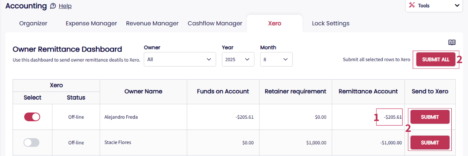 Once Xero is integrated, you’ll find a new “Xero” tab under Solutions > Accounting. This section offers a complete Owner Remittance Dashboard, which gives you real-time visibility of what needs to be paid to each owner, including:
