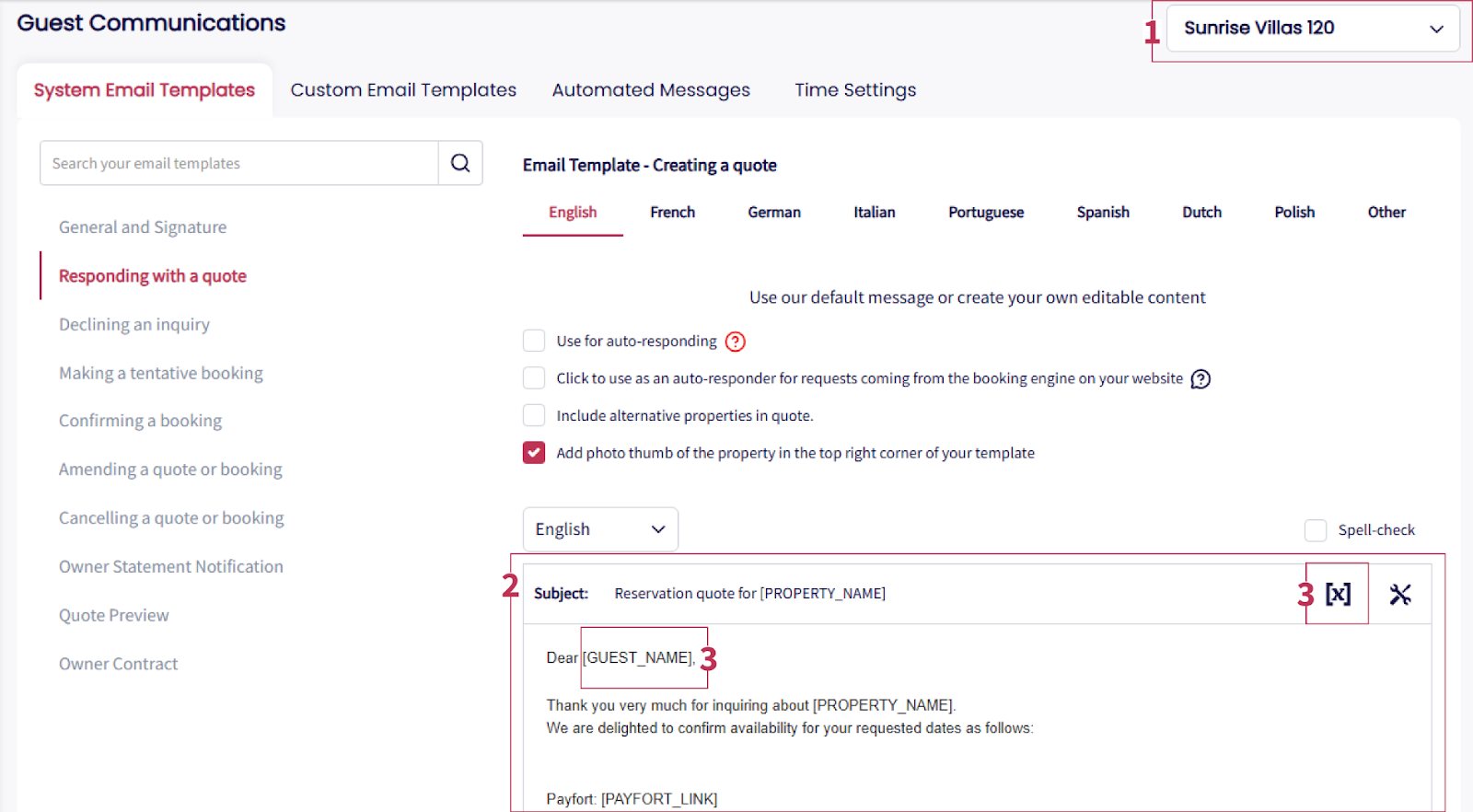 Clear and professional email templates enhance property management by speeding up responses to system actions (e.g., quotes, bookings, owner notifications) and providing flexible custom options for unique needs.