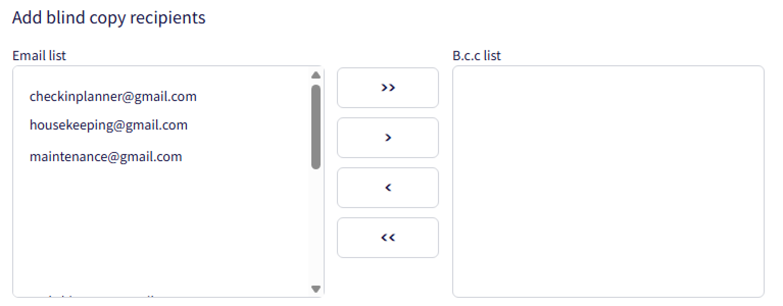 Adding BCC Recipients: Some templates allow adding BCC recipients (e.g., housekeeping, maintenance staff, or owners). These secondary account emails are listed on the left but are not included by default unless moved to the BCC list.