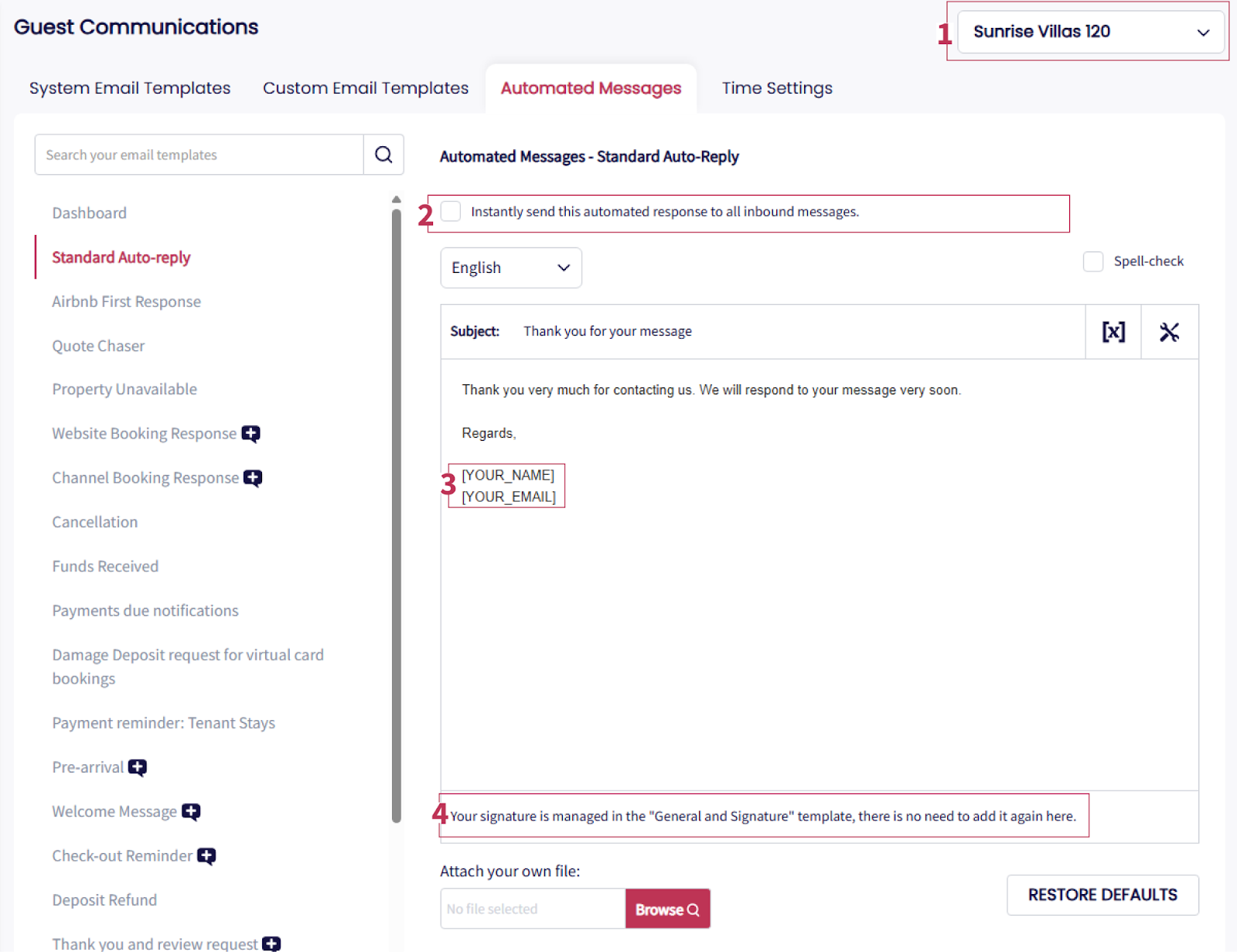 General and Signature: Sets default salutation and signature for all templates, including Automated Messages. The "Almighty" option extends this to all individual emails sent from the Inquiries/ Reservation folders or not tied to reservations.